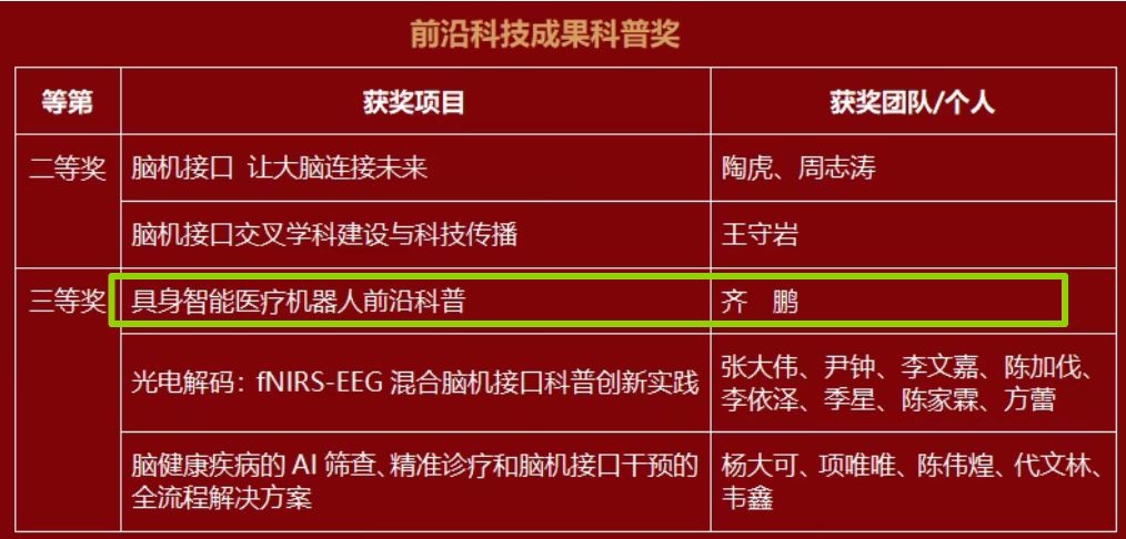 医疗机器人实验室负责人齐鹏副教授申报的“具身智能医疗机器人前沿科普”项目,成功荣获首次设立的“前沿科技成果科普奖”个人三等奖,这标志着黄色漫画网站