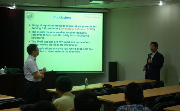 分管科研的季飞副院长的接见,双方表达了在相关领域加强科研合作与交流的强烈愿望。随后童美松教授应邀为相关领域的师生作了一场题为“现实中极具挑战性电磁学问题的积分方程解法”的公开学术报告,受到师生的欢迎。报告着重介绍了童美松教授团队近几年的研究成果,特别是一些既简单有效又快速精确的复杂电磁积分方程数值解法以及它们在求解现实世界中极具挑战性电磁学问题中的应用,比如飞机电磁散射、雷达目标探测、卫星天线设计、芯片电子封装、电磁兼容分析等,引起了在场师生的强烈兴趣并做了充分的交流与互动。