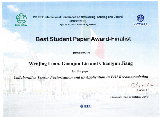 计算机科学与技术系博士生栾文静等完成的学术论文被授予“最佳学生论文提名奖”(Best Student Paper Award-Finalist)。