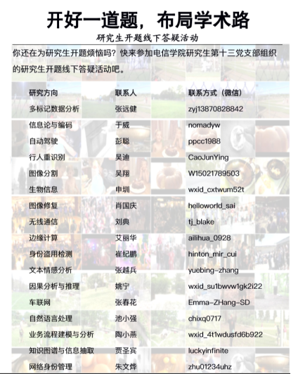 研究生第十三党支部主体是超学制博士生党员,人数众多,在计算机系各实验室内分布广泛,能为低年级学生提供成功和失败的开题、写论文指导经验,本着这个特点,支部提出为低年级博士生和硕士生提供开题咨询与指导的服务,得到了全支部各位学生党员的大力支持。活动分为线上和线下两个渠道同步展开,其中线上旨在通过公布党员研究方向和微信号的方式,在线提供答疑解惑;线下以学生党员所在实验室为基本单位,服务本实验室的低年级学弟学妹开题。活动得到了广大学生党员的大力支持,共收集到17个研究方向,涵盖了计算机学科各个前沿学科。